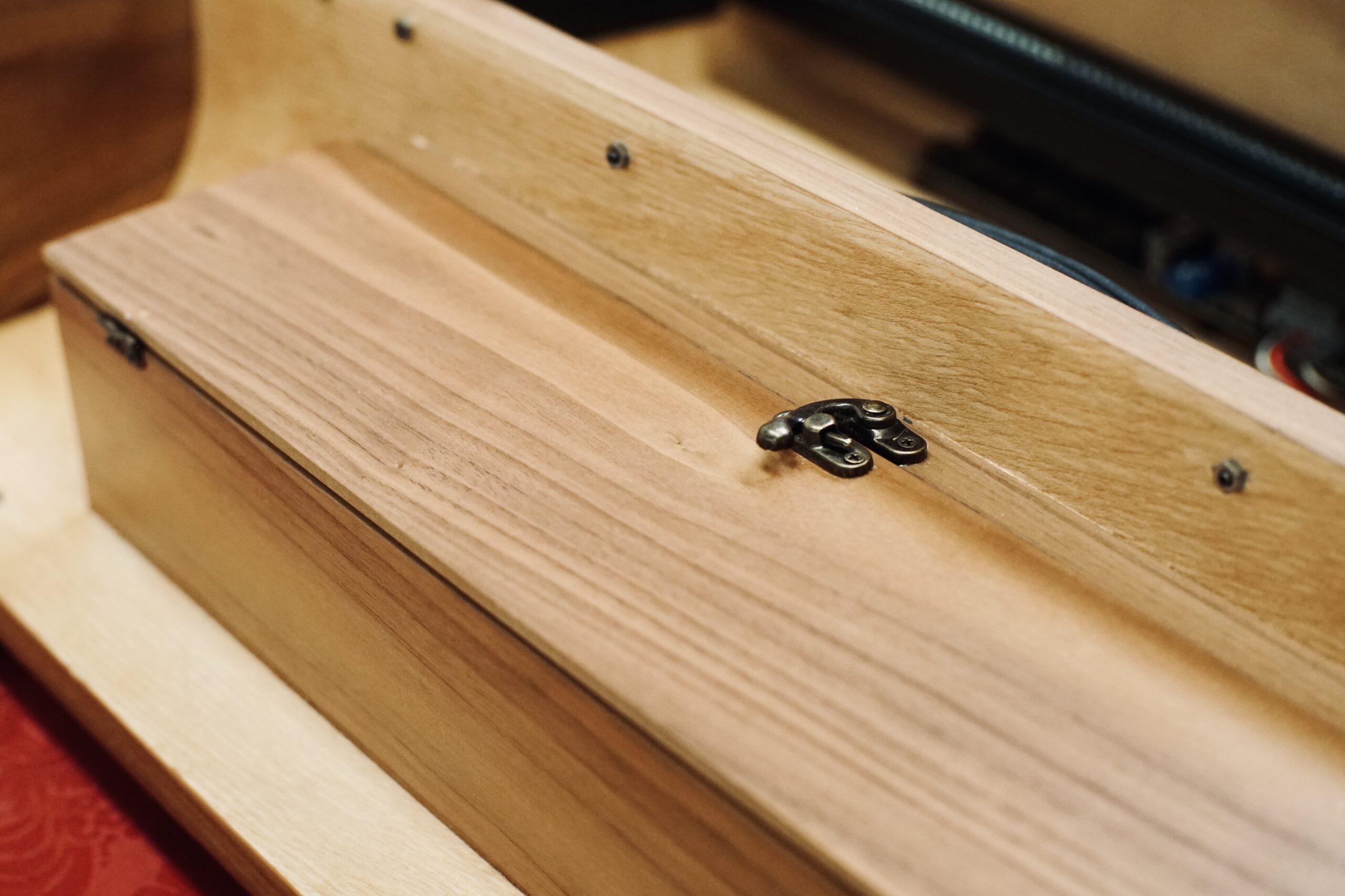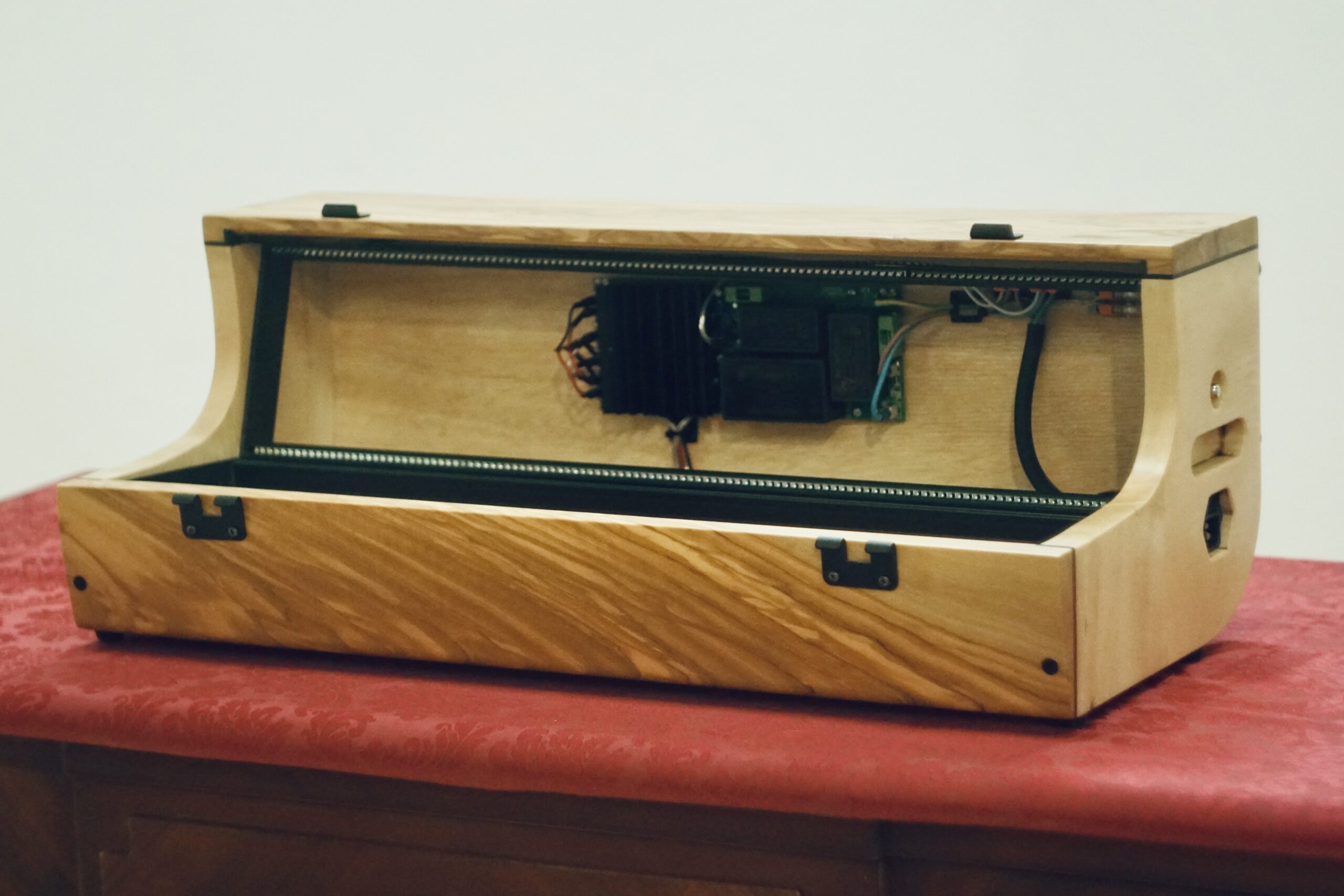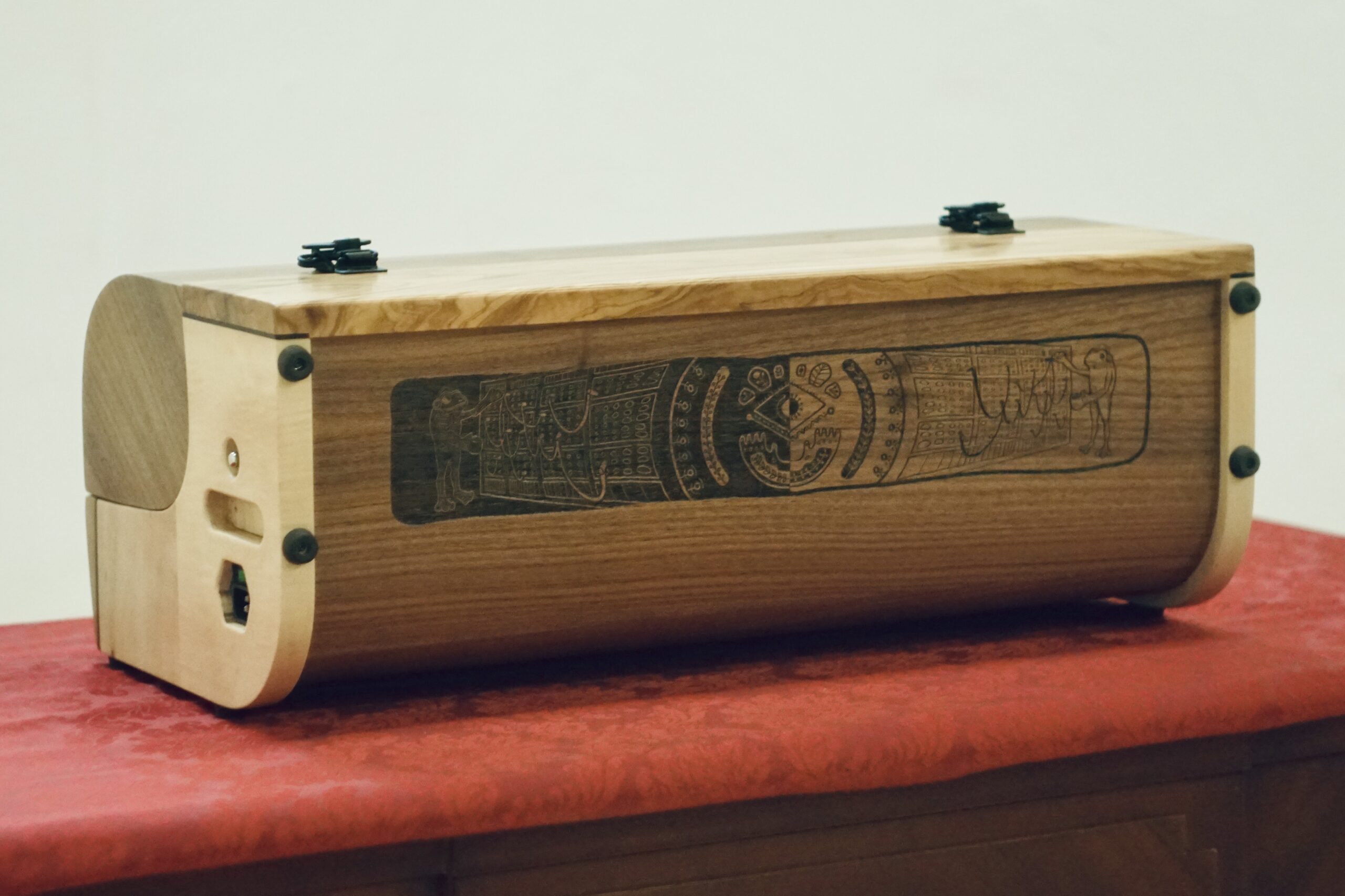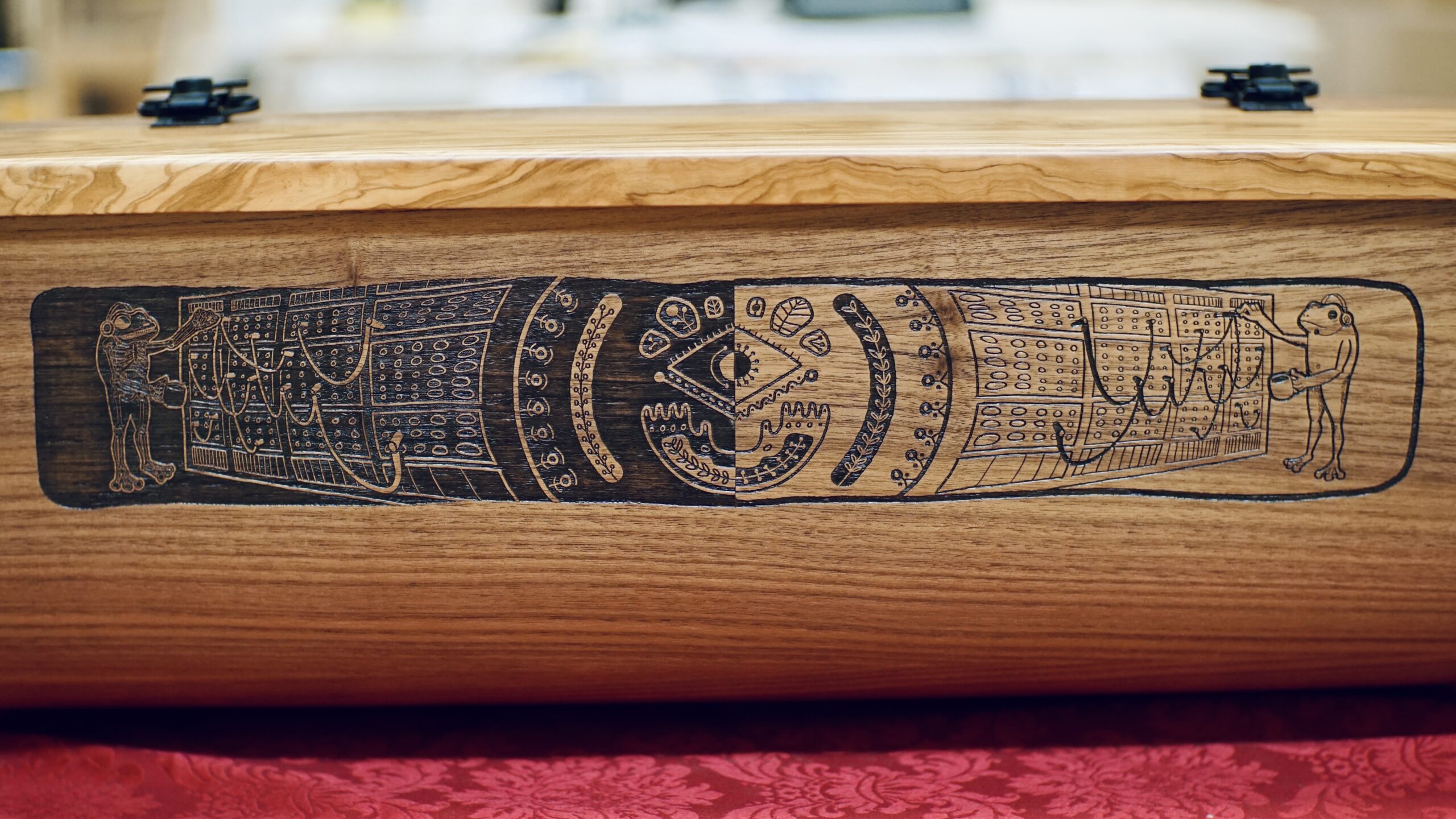 Paisaje personalizado pirograbado en el frontal proyectado hacia el público.
